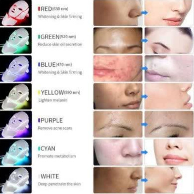 ماسک ال ای دی LED facial mask با طراحی متناسب به صورت، ۷ نور رنگی متفاوت دارد که با بهره گیری از خواص فوتونها – که امروزه ثابت شده تاثیراتی شگرف بر سلولها و مولکولهای اجسام مرده یا زنده دارد – نیازهای پوست را از جمله کاهش چین و چروک، ضد عفونی کردن، باز و بسته شدن منافذ، افزایش متابولیسم و گردش خون، اکسیژن رسانی، رفع آکنه، یکنواخت کردن رنگ پوست، افزایش جذب محصولات مراقبتی و … برآورده میسازد.
