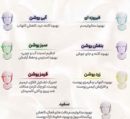 ماسک ال ای دی LED facial mask با طراحی متناسب به صورت، ۷ نور رنگی متفاوت دارد که با بهره گیری از خواص فوتونها – که امروزه ثابت شده تاثیراتی شگرف بر سلولها و مولکولهای اجسام مرده یا زنده دارد – نیازهای پوست را از جمله کاهش چین و چروک، ضد عفونی کردن، باز و بسته شدن منافذ، افزایش متابولیسم و گردش خون، اکسیژن رسانی، رفع آکنه، یکنواخت کردن رنگ پوست، افزایش جذب محصولات مراقبتی و … برآورده میسازد.